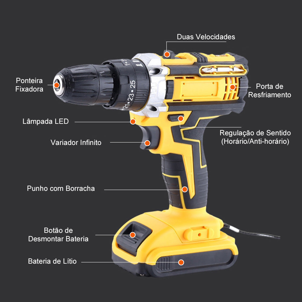 (OFERTA RELÂMPAGO) Conjunto 4 em 1: Furadeira ForceTitan 48V™ + CAIXA DE FERRAMENTAS + BRINDES